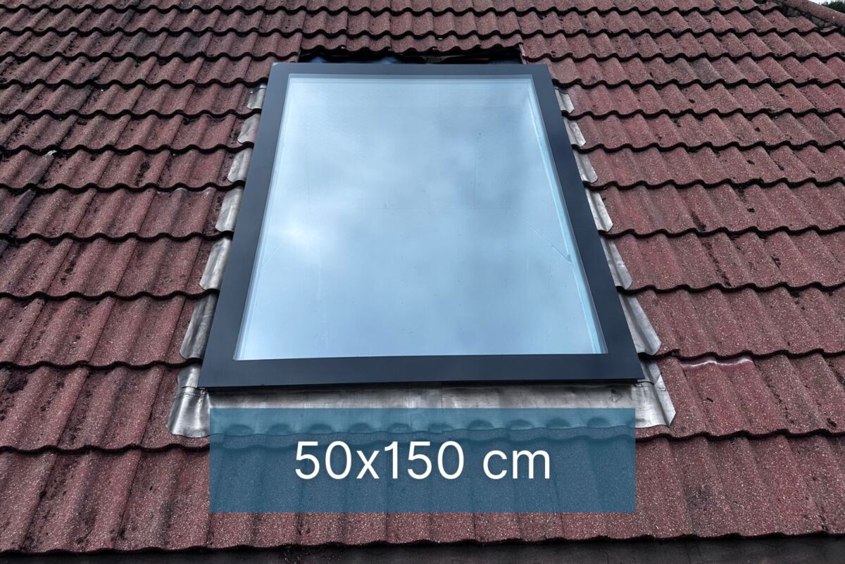 Esta claraboya sin marco, de alto rendimiento y sin apertura, tiene un triple acristalamiento con vidrio templado autolimpiante de 6 mm y un valor U de sólo 0,9 W/m²K. El tamaño del vidrio interior citado es de 50 x 150 cm, véase el diagrama estructural más abajo.